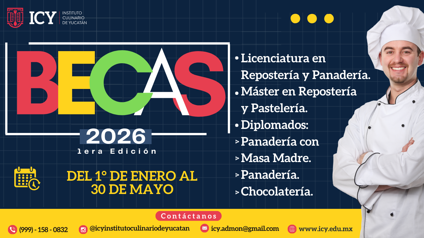 En el Instituto Culinario de Yucatán (ICY), nuestra misión es formar a los próximos referentes del mundo dulce y salado. Por ello, nos emociona presentar la Convocatoria de Becas para Nuevos Ingresos 2026, diseñada para jóvenes y adultos apasionados que desean llevar su formación profesional al siguiente nivel.